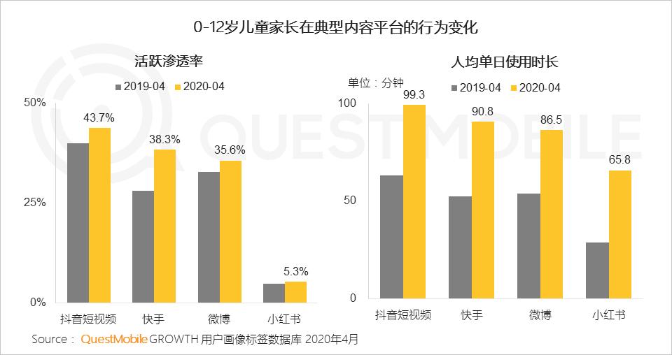 QuestMobile数据显示,0-12岁孩童的父母线上活跃规模约为3亿左右,月人均使用时长呈现持续上升态势,2019年4月、2020年4月分别为128.7小时、145.5小时,活跃领域TOP5为即时通讯、综合电商、在线视频、短视频、地图导航,总体上看,这个群体在泛娱乐应用的渗透率低于全网。
