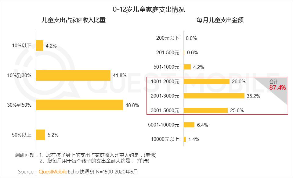 1、儿童支出占家庭收入比重较高,绝大部分家庭每月儿童相关支出金额介于1000-5000元