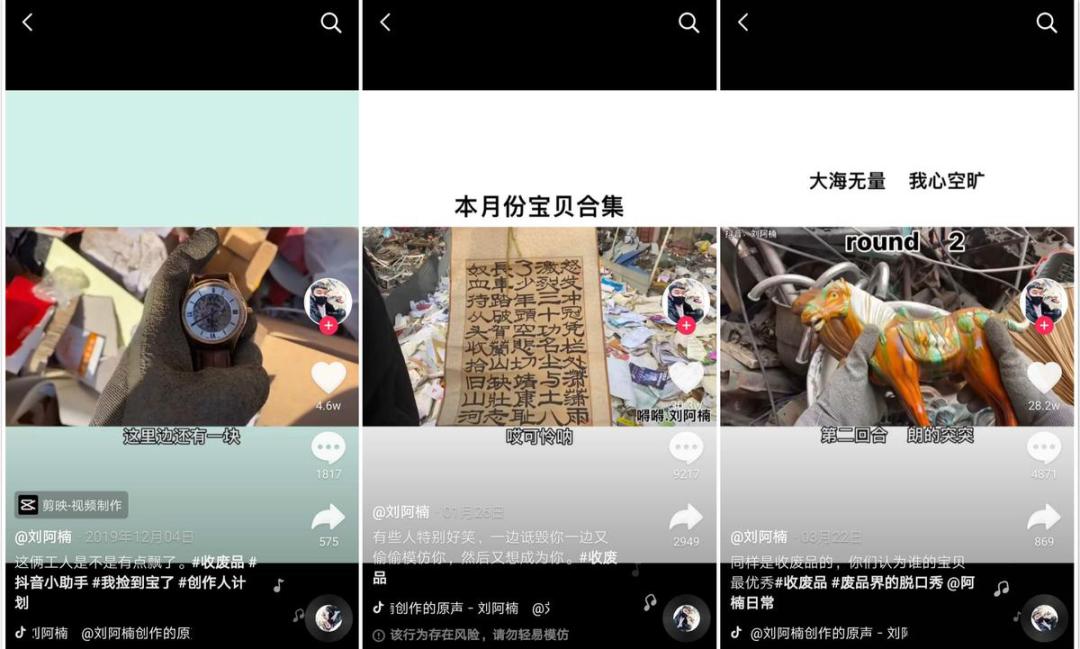 比大能走红更早的刘阿楠,也是一个风格和内容都极为独特的创作者。在抖音里,刘阿楠分享的内容是自己的工作——收废品。从字画、手表到金银首饰、玉石器、电子产品等等,刘阿楠的“淘宝”生活在粉丝眼里极其有趣。