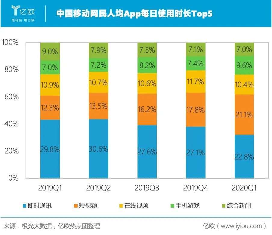 极光大数据显示,移动用户人均App每日使用时长中,短视频在今年一季度达到21.1%,接近第一名22.8%的即时通讯,在线视频则维持在10.4%,在线视频2019年平均时长也仅为11.52%。短视频正对长视频发起挑战,抢占用户心智。