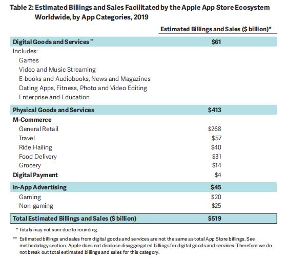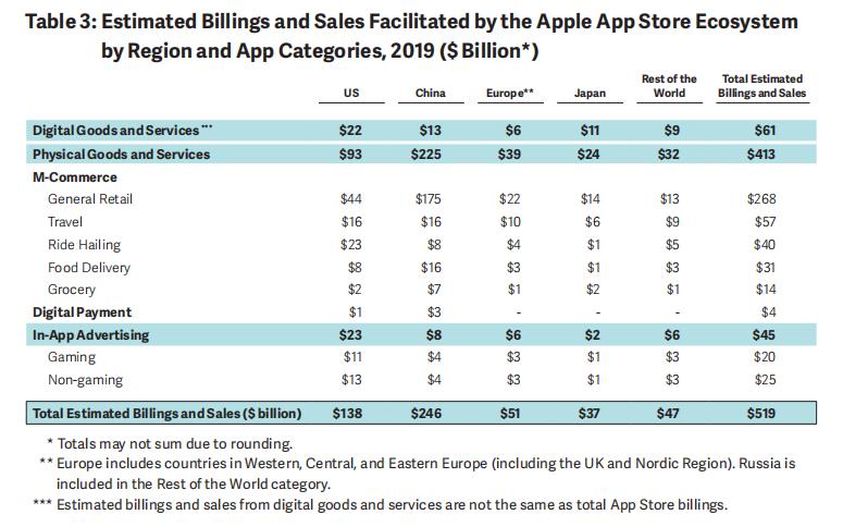 一个显著的特点是,中国区积极利用App Store所带来的便捷销售途径,在应用内销售大量实体商品和服务。仅在实体商品和服务下的电子商务分类中,中国区贡献就高达2220亿美元。