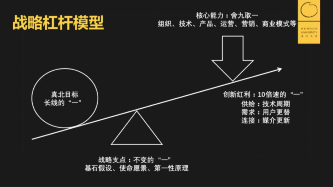 从整体模型来看,战略杠杆涵盖了多个维度,混沌领教张本伟有四句箴言,分别描述了这四个一: