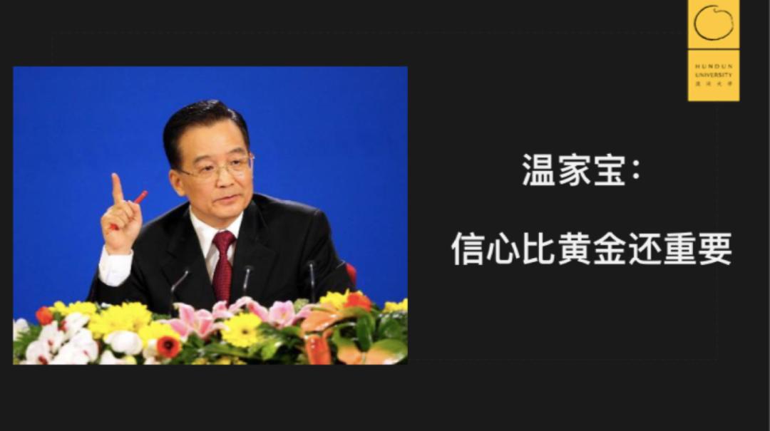 2008年经济危机,当时的总理温家宝说了一句话:“信心比黄金还重要”。黄金只是货币,用来交易而已,但是群体信心非常重要,它是杠杆,只要人民有信心,国家就可以向上。