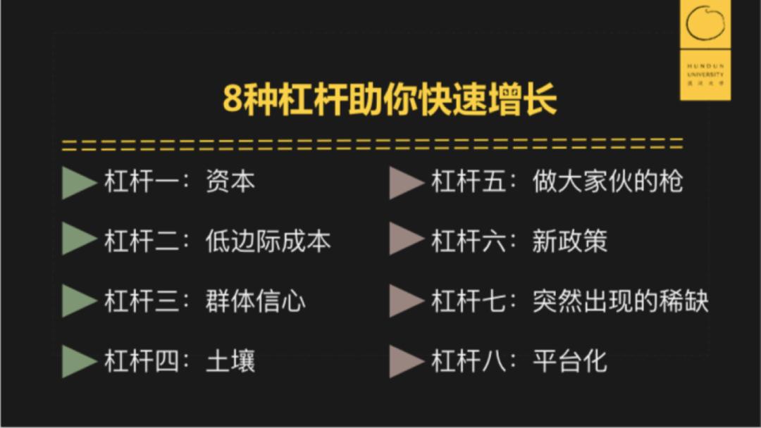 最后一个提醒,不要看到一个杠杆就all in进去,先评估自己的能力是否能抓到这个杠杆。而且,当你有了这些杠杆后,需要评估这些杠杆是否适合你,尤其要通过战略杠杆的大模型进行整体评估。