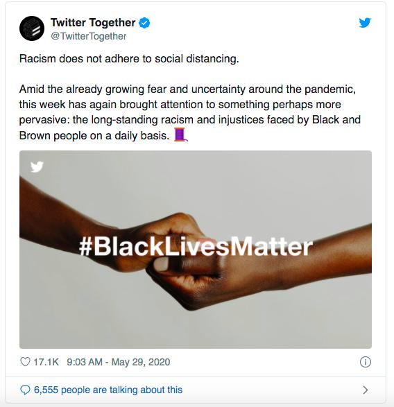 除此之外,Twitter的官方还发布了一条力挺黑人结盟的推文。