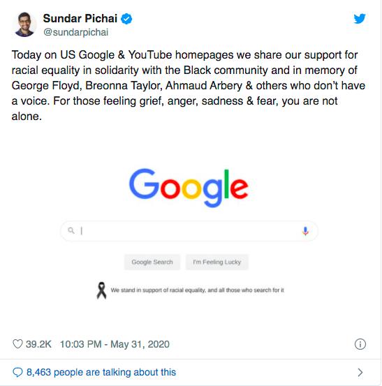 此外,皮查伊还通过推特表示了Google对于黑人群体的声援。