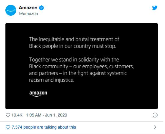 亚马逊官推在6月3日发布的一篇推特中写到:“我们相信黑人的生命至关重要,我们承诺向社会中的黑人和非裔美国人组织捐款1000万美元,并且给亚马逊内部的黑人员工发放赠款,以资助这个国家中尊重教育和种族平等的组织。”