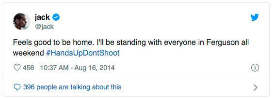 这不是多尔西第一次公开参加这样的民权活动了,在2014年弗格森事件中,多尔西可算是最“硬核”的科技领袖,他甚至亲自去往密苏里加入抗议游行队伍,并就该事件发布了多条推文。而当时,他只是推特的执行董事。