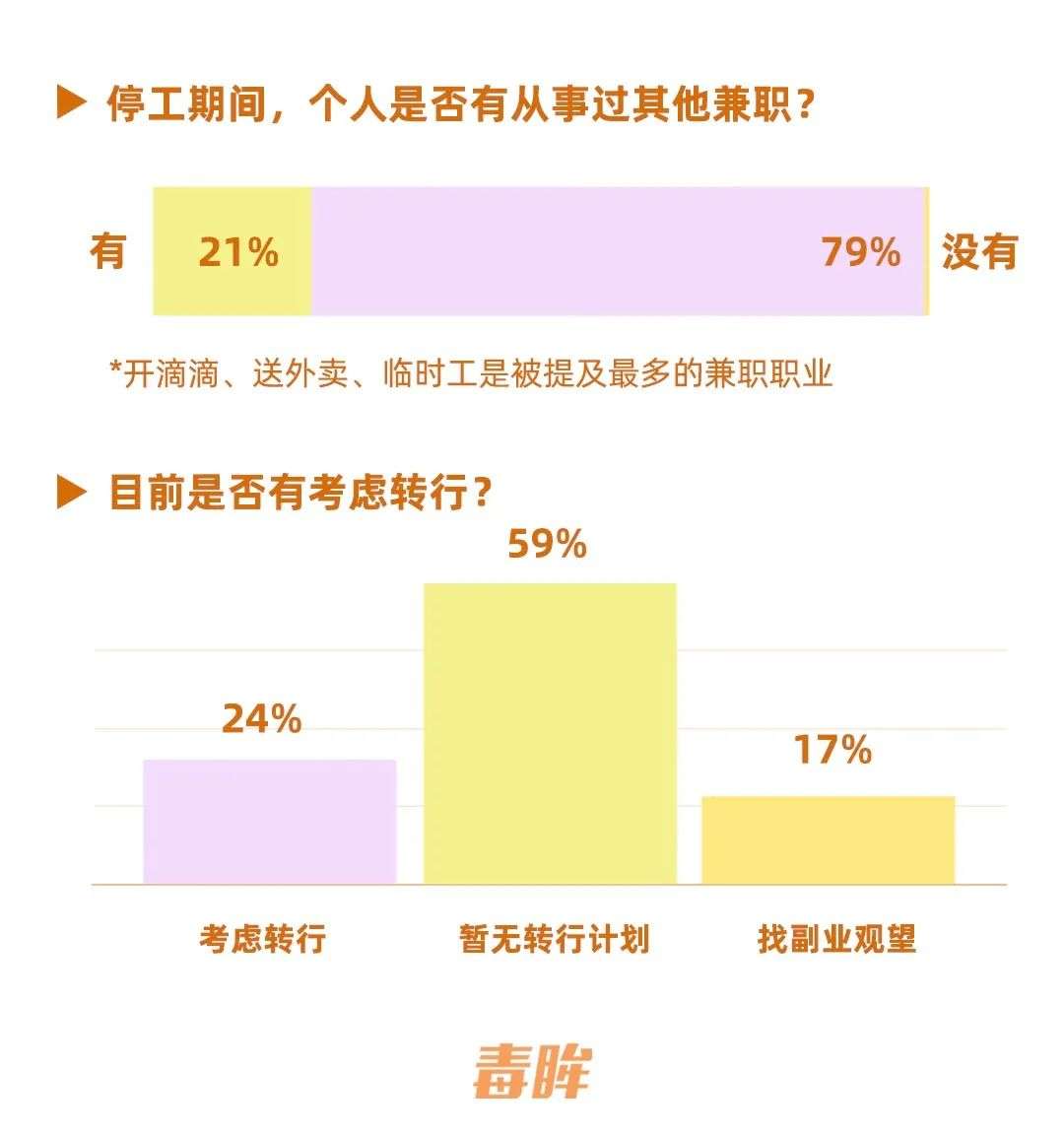 和此前只有21%的从业者选择兼职来等待复工不同,“调查”中有24%的从业者明确表示已经在考虑转行的事情了,另有17%的从业者称会开始选择找副业来观望。而剩下59%从业者还会坚持多久,是否会始终如此笃定,或许没人能给出答案。
