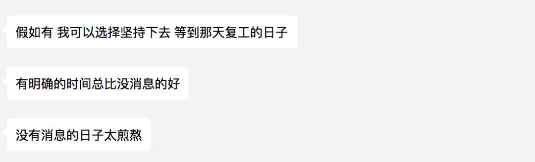 不过在被问到如果有明确的复工时间、但日子比较遥远,他是否还会选择坚持时,小波表示:“假如有,我可以选择坚持下去,等到那天复工的日子。”他表示,很喜欢现在的工作氛围,和同事之间相处得也很融洽。