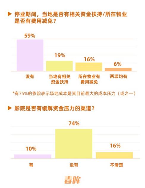 此前也有报道称,部分地区、地产公司对相关影院采取了租金或者物业费的减免,但表示享受到相关优惠的从业者在“调查”中只占到22%(16%的受访者称所在物业有费用减免,6%表示既得到了当地相关资金的扶持,物业费用也有所减免),而59%的受访者则称没有得到任何相关资金上的帮扶。