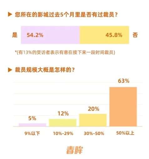 “2、3月份时,就有不少员工主动提辞职了,选择留下来的员工,很多都是有情怀或者比较热爱电影事业的,如今辞退他们,对我们来说确实是个比较难的决定。”另有13%的受访者表示,如果影院再不开门,可能会在接下来一段时间里进行裁员。