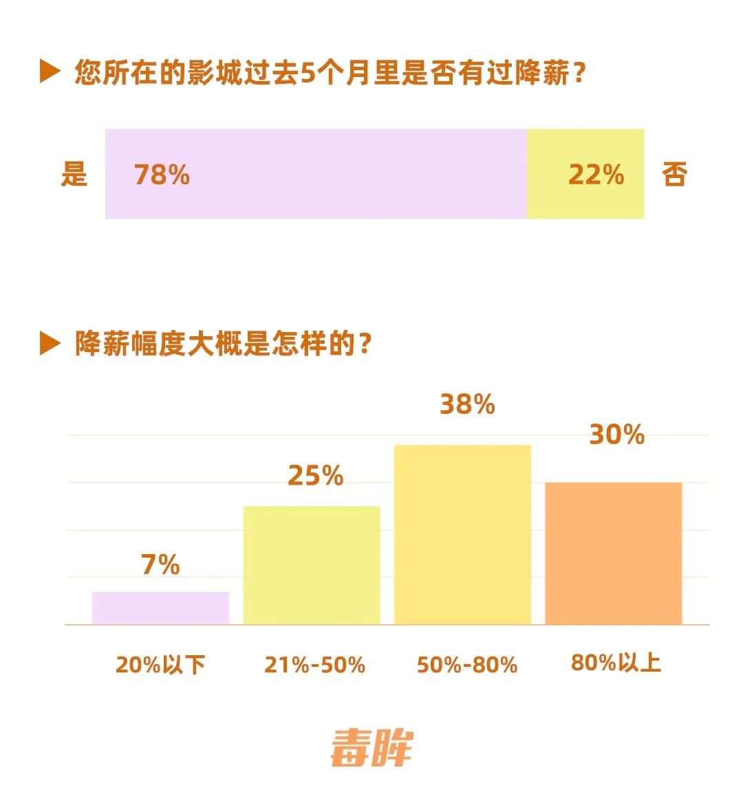 “调查”指出,有78%的影院在过去5个月里采取过降薪,其中又有68%的影院降薪规模达到50%以上(包括30%的影院降薪规模超80%),不少影院实际上只发千元左右的基本工资。