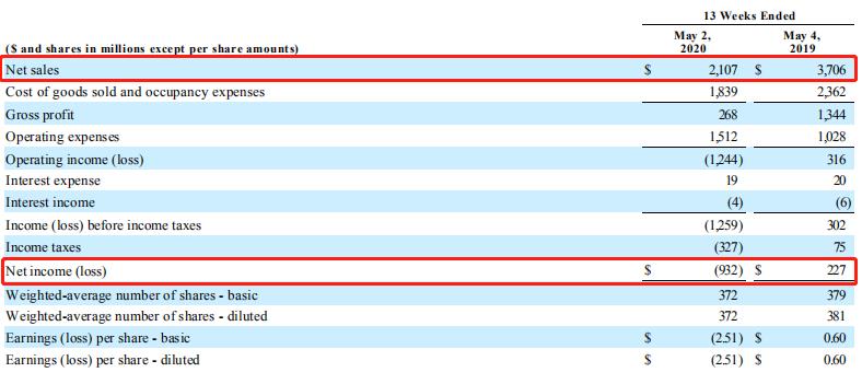 拥有Gap、Old Navy等品牌的盖普公司在2020年第一财季(2020年2月1日~5月2日),销售额下滑43.1%至21.07亿美元(约合149.02亿人民币),而上年同期为37.06亿美元(约合262.1亿人民币);净利润亏损9.32亿美元(约合66亿人民币),上年同期录得净利润2.27亿美元(约合16.05亿人民币)。
