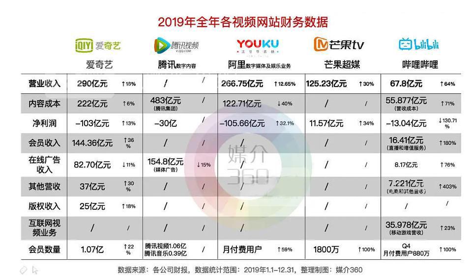 原因也很简单,长视频玩家爱优腾三巨头的背后站着的是互联网巨头BAT。虽然有巨无霸撑腰,爱优腾三家常年都在亏损状态中。有媒体做过一张表,统计了一下2019年全年年各视频网站财务数据。