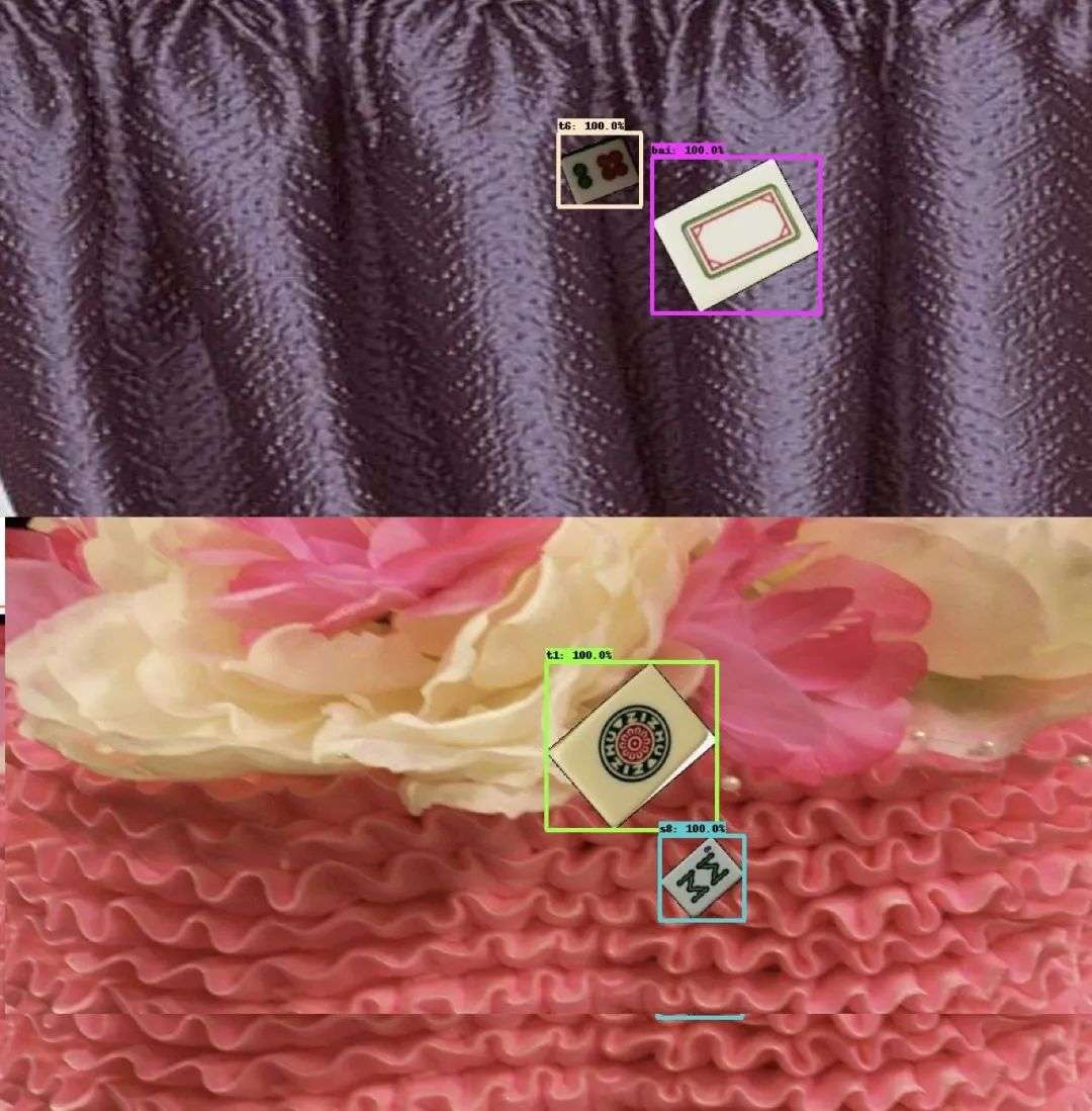 第二部分数据是真正帮助提高模型泛化能力的生成数据,这部分数据使用了两个数据源来合成,34张麻将牌的不同样式的图片共600多张,以及4000多张纹理图片的数据集。随机合成生成的场景图片:每次挑两张麻将进行一定的随机旋转/缩放/亮度及对比度调整/投影变换后放在一张随机选的纹理图上作为背景,生成合成图片以及对应的标注数据(麻将牌的外框作为最小外包矩形参与随机变换使得标注信息需要的label&bounding box都是已知信息,可以按模版生成标注xml文件不需要人工标注)。