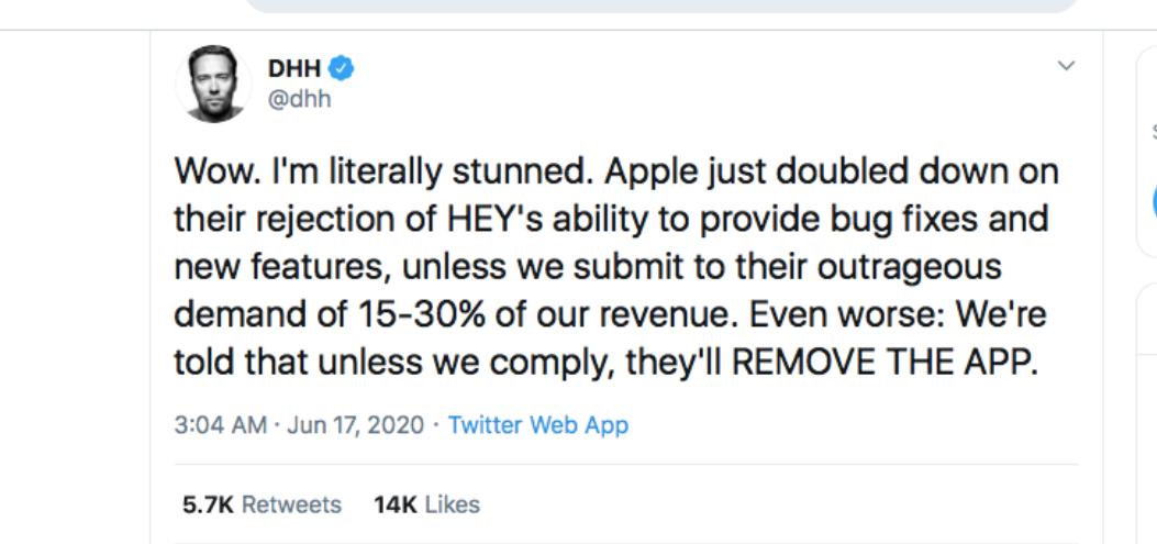 其中,苹果抽成一事成为一大争议点。Basecamp联合创始人兼首席技术官David Heinemeier Hansson发推特公开表示受到了苹果的施压,并形容苹果为“黑社会”:“我太震惊了。苹果就在刚刚加倍拒绝了我们修护hey漏洞和上新功能的请求,除非,我们向苹果交付我们营收的15%-30%。更糟糕的是,他们还说,如果我们不被遵从,他们会移除这款应用。”