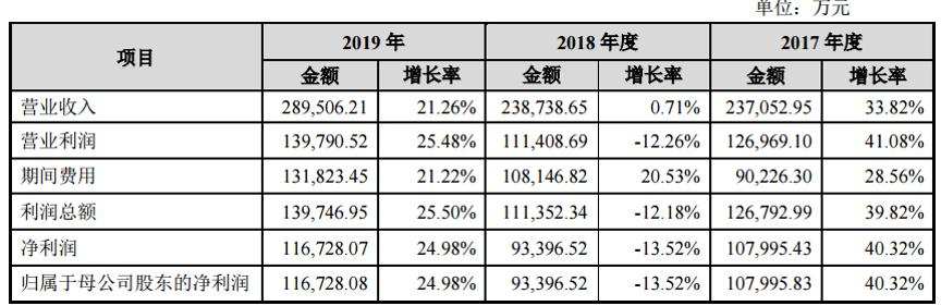 2017-2019年,甘李药业营业收入分别约为23.71亿元、23.87亿元、28.95亿元,分别较上年同期增长33.82%、0.71%和21.26%。