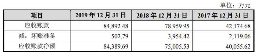 招股书显示,2017-2019年末,公司应收账款分别为4.22亿元、7.90亿元和8.49亿元,分别较上期末增长11.76%、87.22%和7.51%。