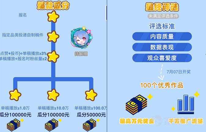 新星计划:针对粉丝数小于5万的新手UP主,B站每次针对三个垂直类别,例如,音乐、绘画、搞笑,鼓励UP主投稿,最终从视频内容质量、数据表现、用户喜爱度(点赞、收藏、投币)三大维度,结合评委组意见综合评分,选出超人气视频,UP主就可瓜分万元奖金。
