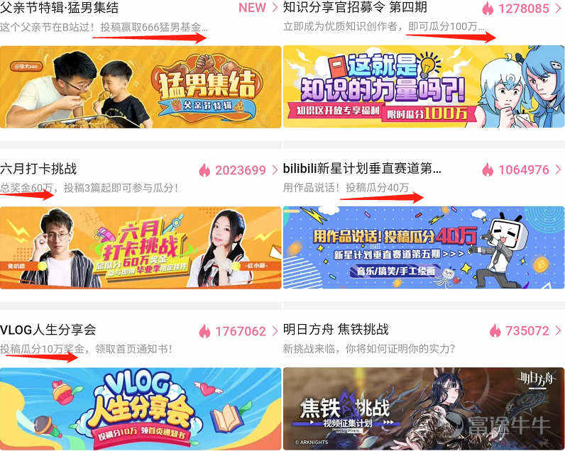 热门活动:B站会不定期设置流行话题,奖励包括头像、现金、大会员,激励用户参与。例如最新的「父亲节特辑」,UP主投稿相关视频,就有机会获得666元的「猛男基金」。