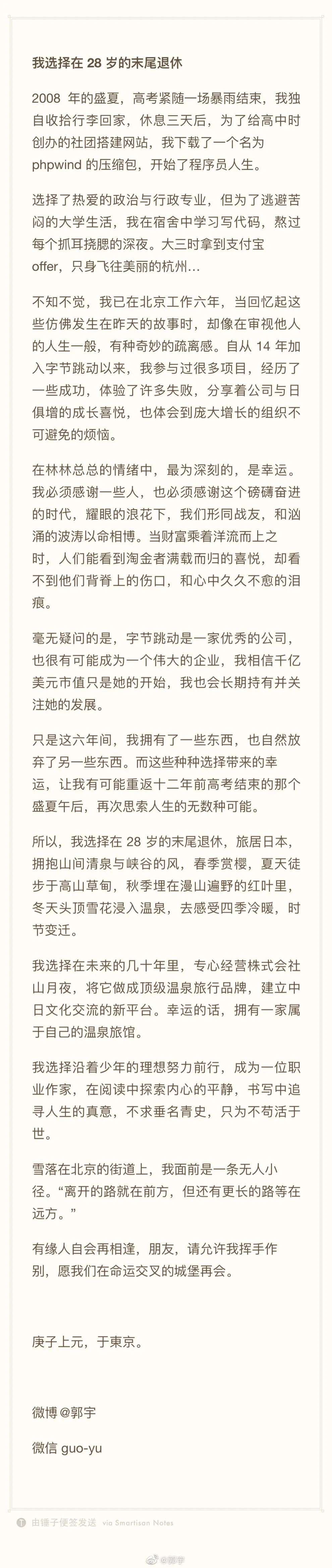 从 2014 年到 2020 年,郭宇一直在字节跳动从事开发工作。直到 2020 年的 2 月,他在微博上宣布退休并旅居日本。
