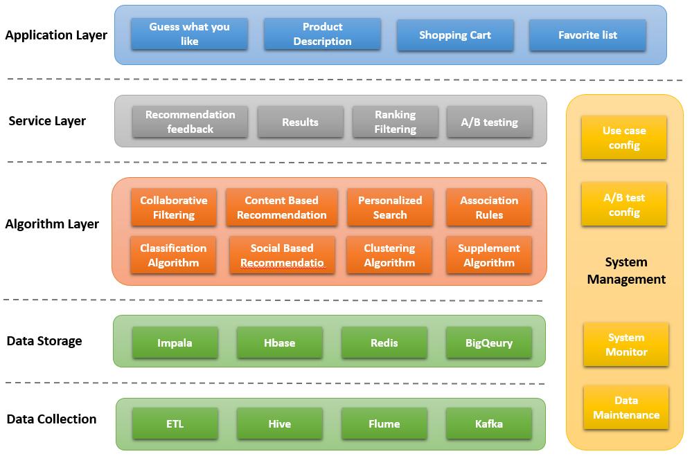 实时推荐系统需要强大的数据作支撑(包括数据的收集和储存),用以支持相对抽象的层面(包括算法层面、服务层面和应用程序层面),从而解决业务方面的问题。