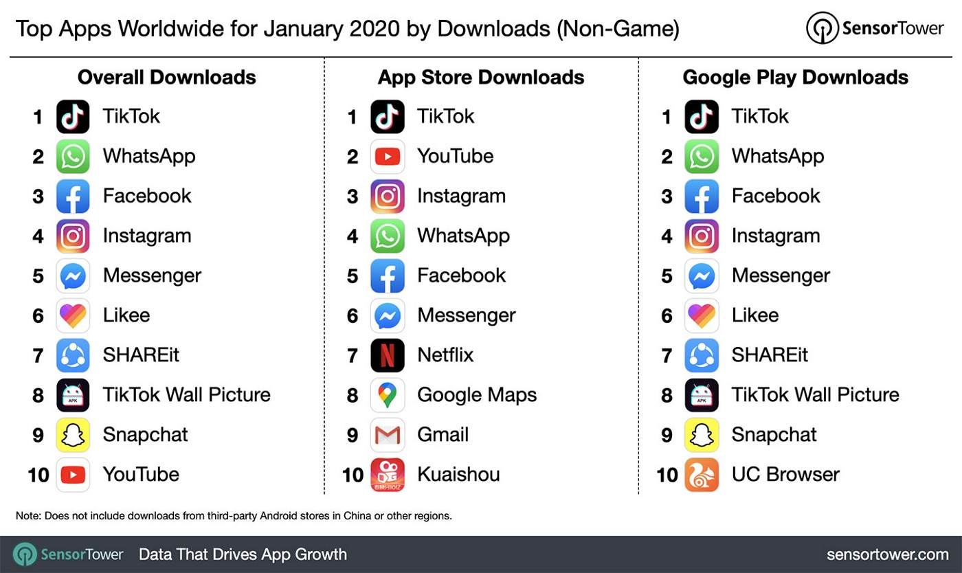 2020年1月,抖音成了下载量最高的APP|图片来自 SensorTower