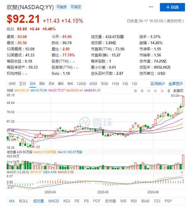 对比同行业来看,同为秀场直播,也同样遭遇了疫情的波动,但从资本市场的表现来看,投资者对于YY的认可度却更高。截止周三美股收盘YY股价报92.21美元,当日上涨14.15%。从YY的日K线来看,其股价走势依旧呈上扬状态。究其原因,或许是YY的海外故事给了投资者更多的信心。YY最新财报显示,截止今年第一季度,其全球平均移动端月活跃用户达到5.201亿,其中77%来自海外市场。