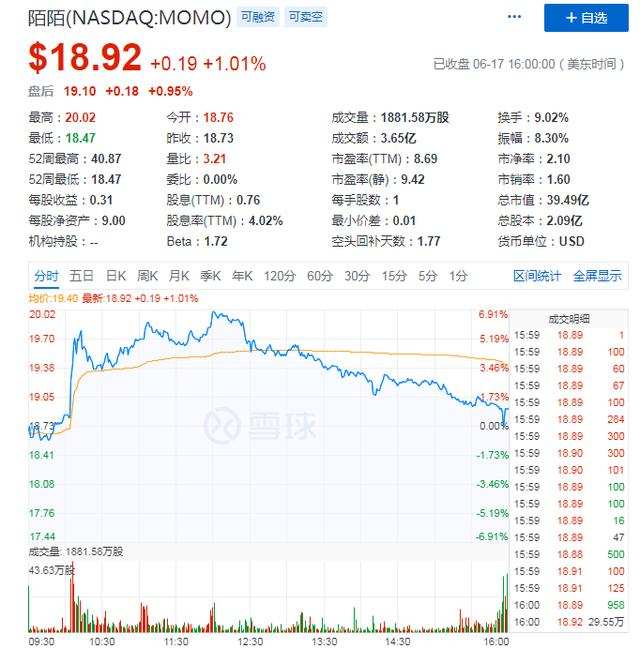 就今年陌陌在资本市场的表现来看,实际上,早在今年美股崩盘前,陌陌股价就从1月中旬开始提前进入了下行通道,之后也未能像许多股那样在3月低点之后迎来反弹。资料显示,陌陌股价较之今年1月40.87美元的高点跌去了近50%,与2018年的历史最高点相比更是跌去了近60%。本月16日,陌陌股价又破52周新低,最低至18.55美元,截至周三美股收盘报18.92美元,盘后上涨0.95%。