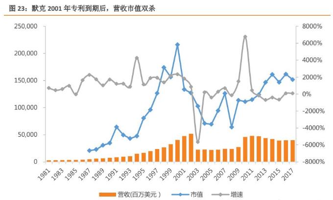 这里面例子不胜凡举,如默克的洛伐他汀(美降脂),1987年上市,第二年就突破2.6亿美元的惊人收入,曾经作为全球降脂药物的绝对领导者,在2001年专利到期后,当年的市占率就从接近100%跌到不足0.5%,股价也惨遭腰斩。