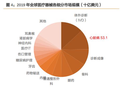 据2019年全球医疗器械细分市场规模来看,体外诊断、心脏病、诊断成像、骨科、眼科这五大类占据市场规模最大,市场天花板也较高。