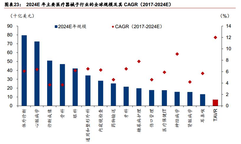 而结合增速来看,TAVR(经导管主动脉瓣置换术)也就是启明医疗、微创心通、沛嘉医疗等公司布局的行业方向,其增速在医疗器械子行业可谓一马当先。所以高瓴资本积极布局也就不难理解了。