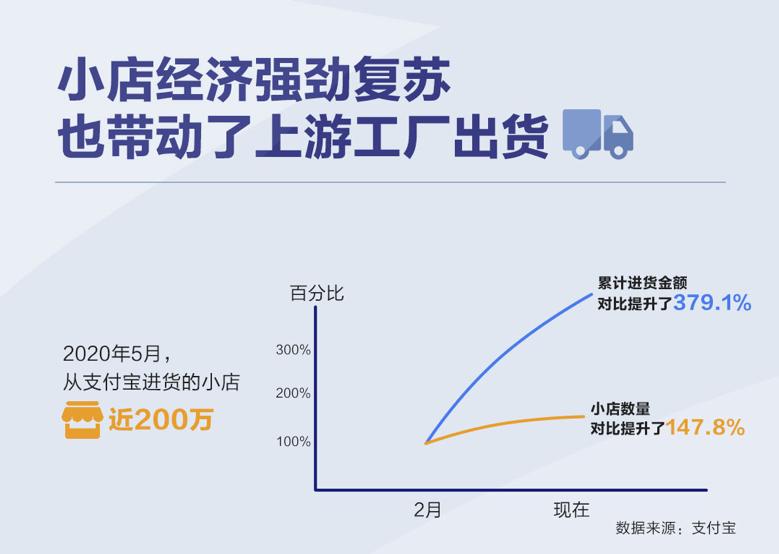 数字化激活的小店经济活力,也传导到了上游制造业。聚集了大量小店的支付宝,正在形成上下游联动的产业链,最近一个月,有200万小店涌入支付宝进货平台,比2月翻了一番,累计进货金额也提升3倍多,这大大提高了上游制造业的市场灵敏度和效率。