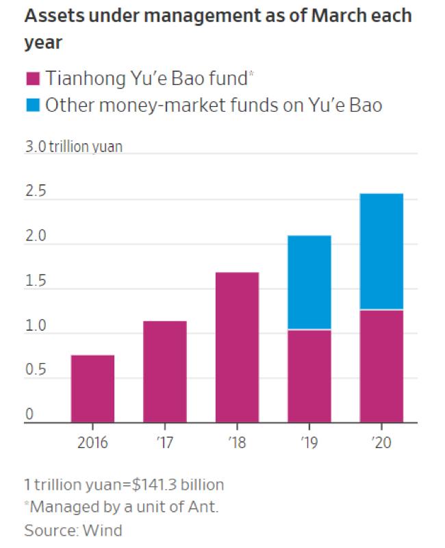 根据Wind的数据,截至今年3月,在蚂蚁的余额宝平台上出售的29只货币市场基金管理的资产总额为2.58万亿元,同比增长21%。