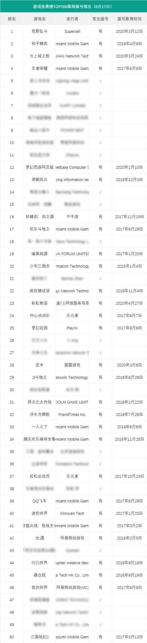 一、游戏免费榜TOP200中,有76款“无版号”或“套版号”
