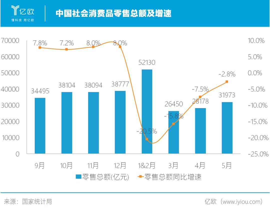 根据国家统计局的数据,今年1-5月份,社会消费品零售总额为138730亿元,同比名义下降13.5%;而全国网上零售额40176亿元,同比增长4.5%,其中,实物商品网上零售额33739亿元,增长11.5%。