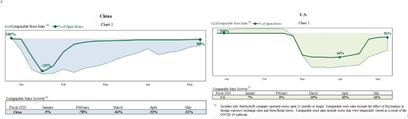 疫情期间,星巴克中国和美国市场的同店销售发展情况,图片来自星巴克官网