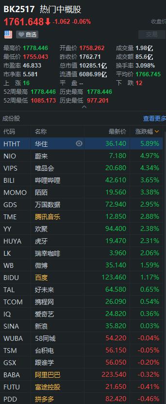 涨幅较大的有:小牛电动涨10.38%,华住涨5.89%,唯品会涨4.34%,陌陌涨3.38%,欢聚涨2.38%,瑞幸咖啡涨2.06%,微博涨1.59%。