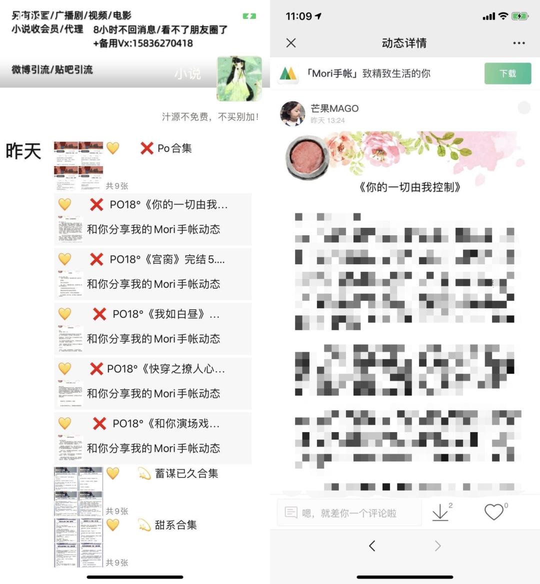 首先比较常见的就是书城,黑产可以从正规版权网站剽窃文章、小说等比较高质量的内容,然后通过改题目,改人物姓名让人无法分辨,最后从其控制的微信账号中发布一两章的章节,感兴趣的读者就会被里面的内容所吸引,通过里面的链接把用户引导到外部网站的书城网页。如果用户想继续看这些小说就必须充值,这就是变现的方式。