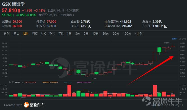 另一方面,跟谁学涨势依旧凶猛,6月18日股价再涨8.46%,创历史新高57美元/股,总市值超134亿美元。多头再度成功逼空做空者,空军损失惨重。