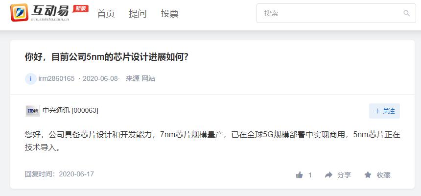 此前,中兴通讯17日在深交所互动平台上曾表示,公司具备芯片设计和开发能力,7nm芯片规模量产,已在全球5G规模部署中实现商用,5nm芯片正在技术导入。