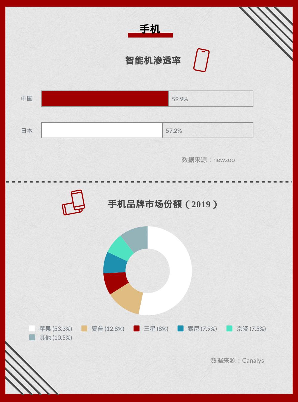 日本的智能手机渗透率与中国相当,苹果是当地绝对的霸主,市场份额超过50%。外国品牌中,三星也挤进了市场前五。前五中另外3个席位都由日本本土品牌占据。
