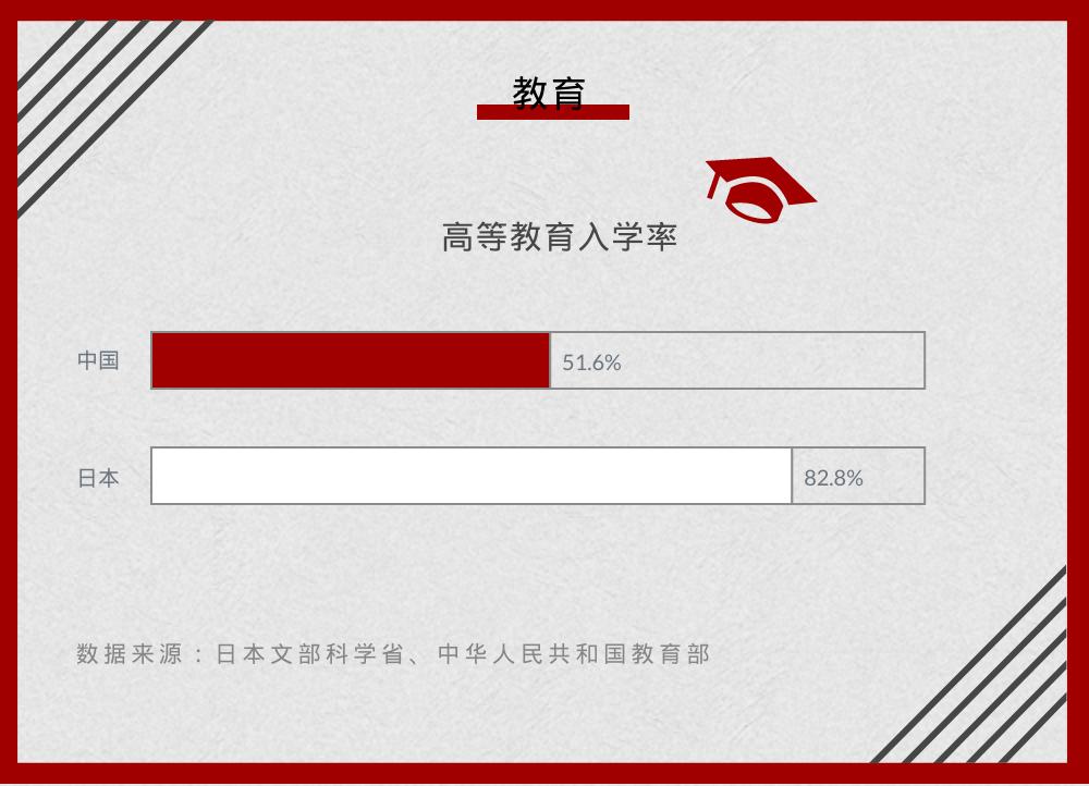 同时,日本高等教育入学率也远高于中国。2019年,日本高等教育入学率达到了82.8%,而中国仅51.6%。值得注意的是,此处日本的高等教育包括了大学、短期大学、专门学校以及高等专门学校四年级以上的学生。
