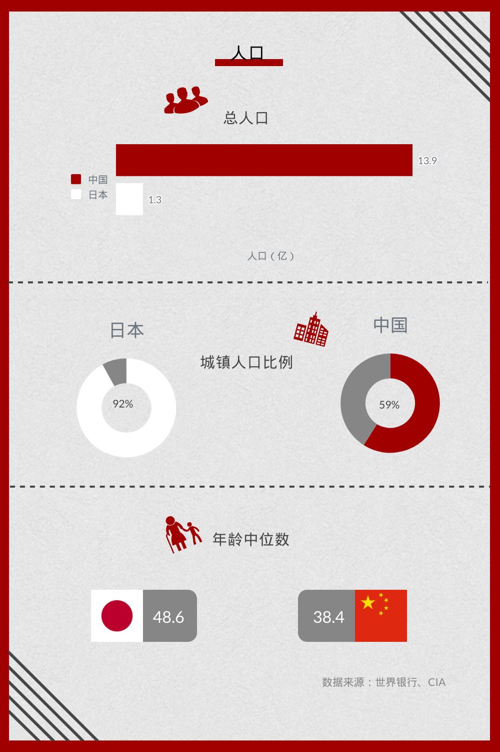 在前几期的梳理中,我们看到与拉美、东南亚、印度等新兴市场相比,年龄中位数38.4岁的中国人称得上“高龄”。然而,日本的年龄中位数却比中国大了整整10岁,人口年龄中位数世界第二高。