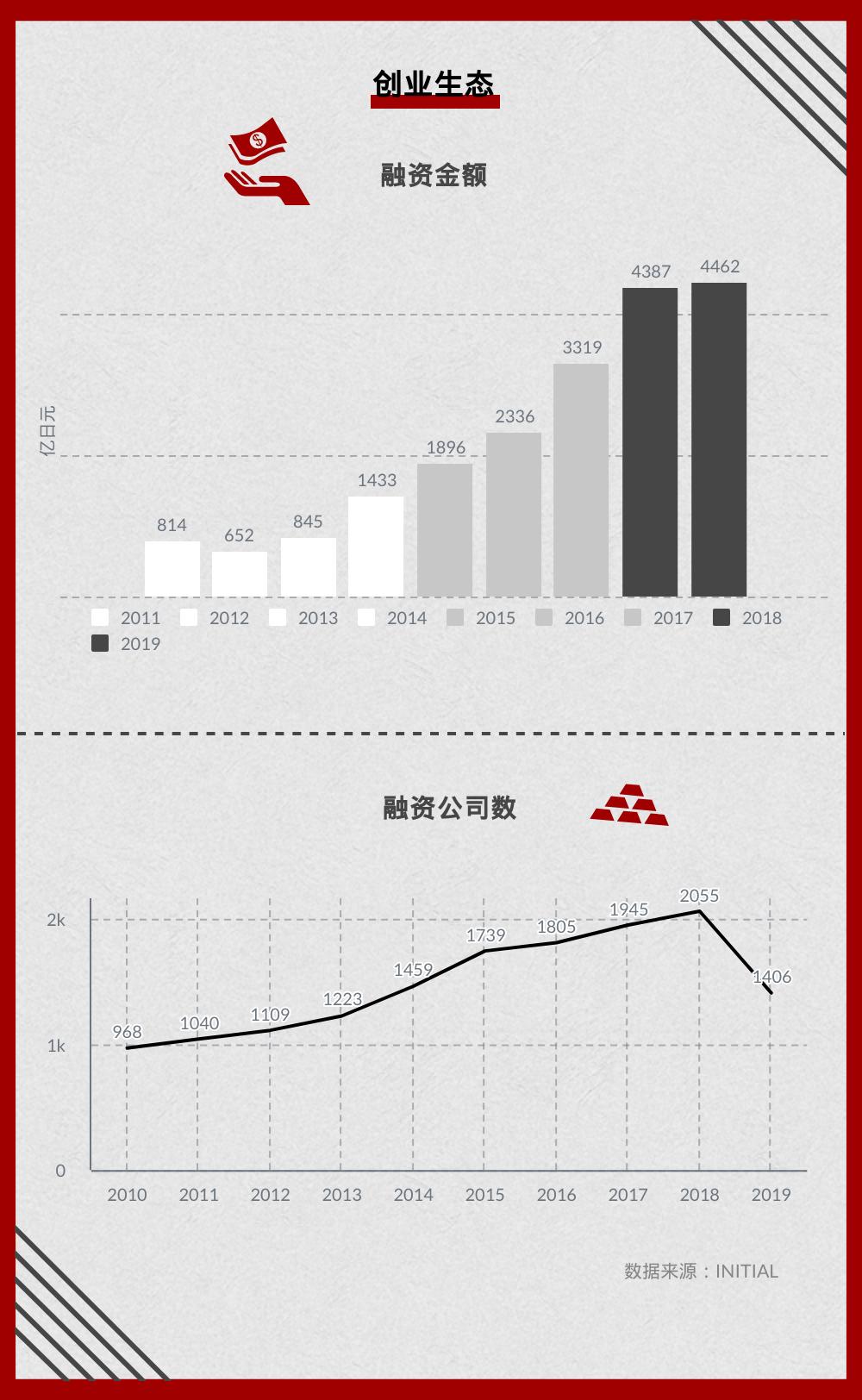 不过,这一现象近几年似乎正发生改变。一则日本数据信息分析公司 INITIAL 发布的报告显示,从2011到2018年,日本创业公司累计融资金额从800亿日元(约7.5亿美元)涨到约4000亿日元(约40亿美元)。但从2018年到2019年,这一数据涨幅不大,获得融资的创业公司数甚至有所下降。