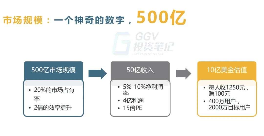 在给一个公司应该有的合适的市场规模下判断时,我自己估算了一个数字,500亿。这是个虚数,也许是200、300亿,也许是1000亿,具体数值取决于行业的利润率水平,但是,只有在具备200亿~1000亿的市场规模时,才有可能成就一家10亿美金估值的公司。