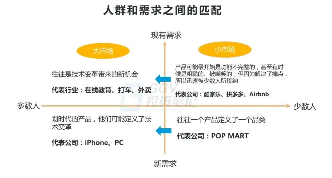 我们再来看一下这张图,先看第一象限,也就是图片右上部分,“现有需求、少数人”是最容易切入的领域。“现有需求”的概念代表着产品不用创造新需求,公司只要针对现有用户的痛点,提供创新的解决方案即可。