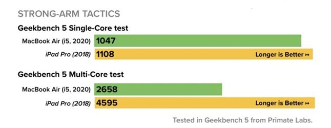 ▲搭载i5处理器的MacBook Air 2020款与搭载A12X的iPad Pro 2018款基准测试对比,数据来源:Geekbench