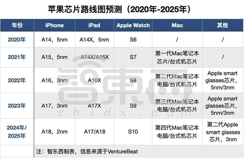 ▲苹果芯片路线图预测(2020-2025年,来源:VentureBeat)